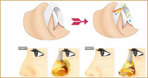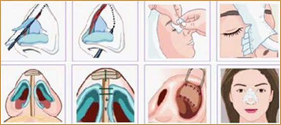 1、鼻孔内进路:鼻孔内进路全鼻整容术,此法先在鼻孔内鼻侧软骨和鼻翼软骨之间做切口,进行潜行分离,之后截除鼻背的驼峰,再用骨锉将骨和软骨的截除面锉平。进而通过缩窄鼻背、鼻下部的改造,完成鼻整容术。