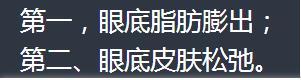 【症状:】眶内脂肪堆积过多或下睑支持结构变薄弱而发生改变时,导致下眼窝脂肪膨出,或伴有轻微眼底细纹