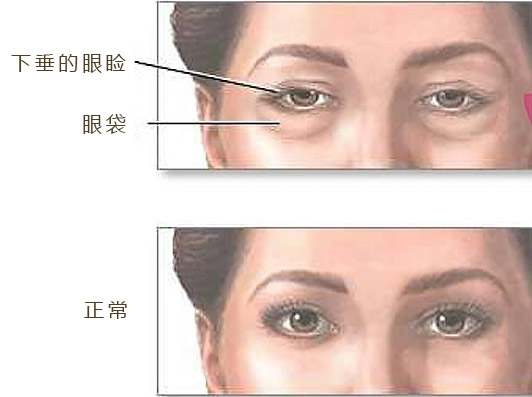 【症状:】皮肤、肌肉和结缔组织老化松弛,伴有一定程度的下眼皮松弛